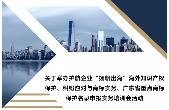 • 關(guān)于舉辦護(hù)航企業(yè)“揚(yáng)帆出海”海外知識產(chǎn)權(quán)保護(hù)、糾紛應(yīng)對與商標(biāo)實務(wù)、廣東省重點商標(biāo)保護(hù)名錄申報實務(wù)培訓(xùn)會活動